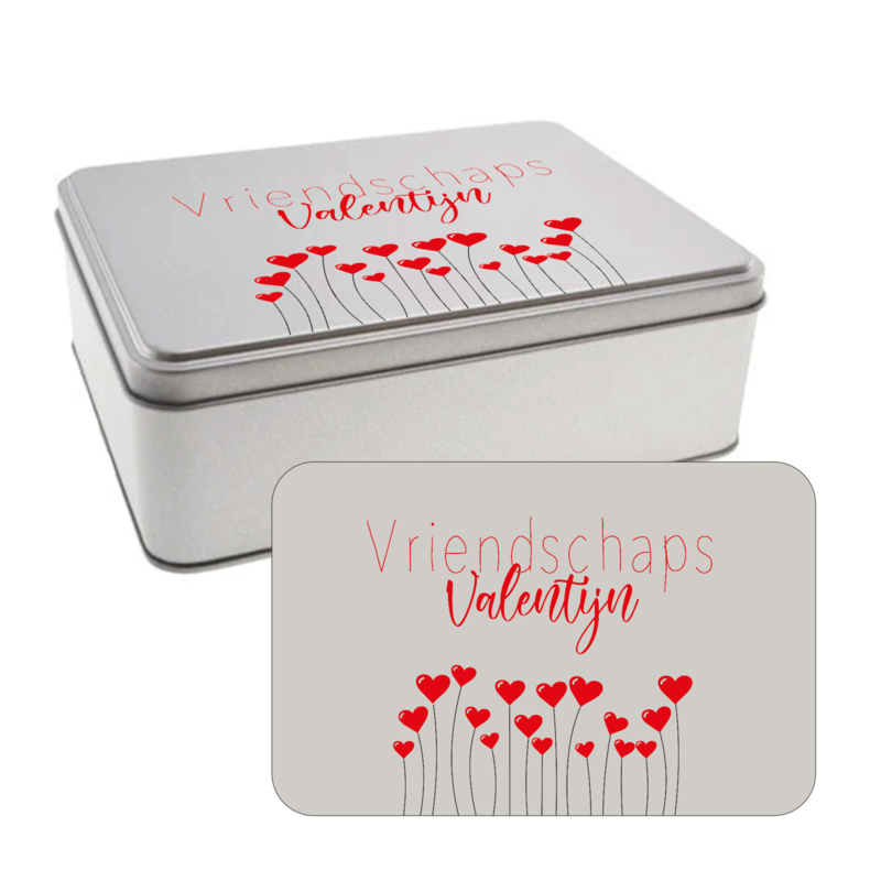 Artikelnummer: Bl010 OverzichtKoekblik met bedrukking Valentijnsdag. Uiteraard ook met andere ontwerpen naar keuze, stuur een e-mail naar info@studiojitske.nl voor de mogelijkheden.