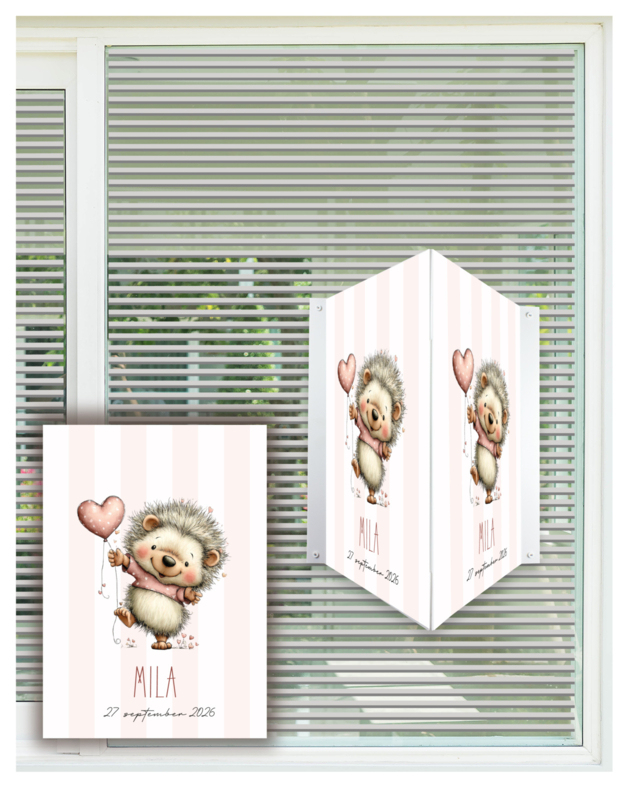 Dit raambord, makelaarsbord met egel, hart ballon en naam ter aankondiging van de geboorte van een baby.