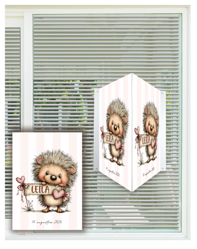 Dit raambord, makelaarsbord met egel, bord en hartjes en naam ter aankondiging van de geboorte van een baby.