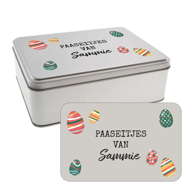 Artikelnummer: Bl011 OverzichtKoekblik met bedrukking van naam en paaseitjes. Blikje om in de vaste tijd jouw kindje het snoepgoed in te laten bewaren. Uiteraard ook met andere ontwerpen naar keuze, stuur een e-mail naar info@studiojitske.nl voor de mogelijkheden.