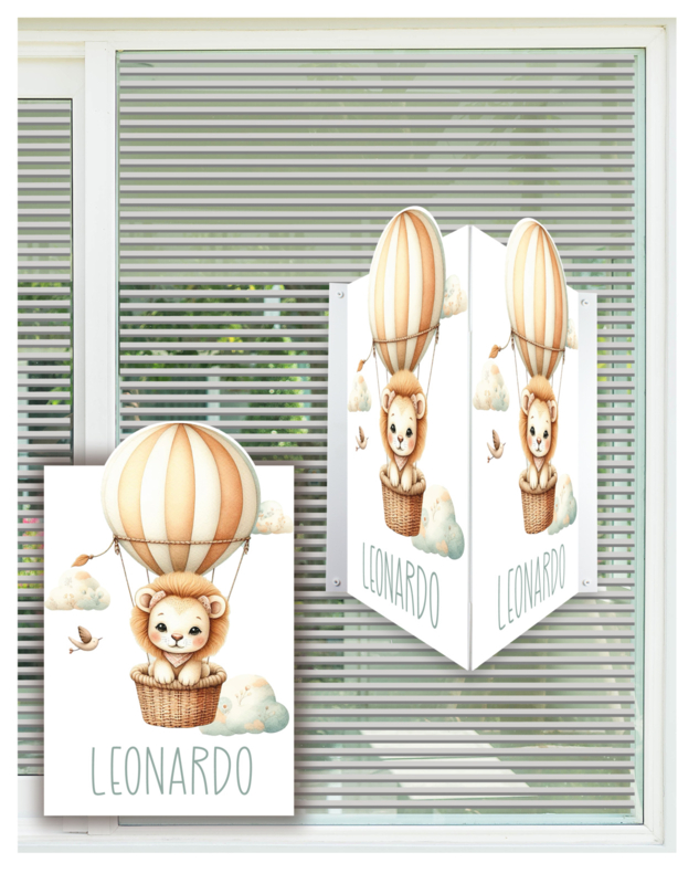 Dit raambord, makelaarsbord met leeuw in luchtballon en naam ter aankondiging van de geboorte van een baby.