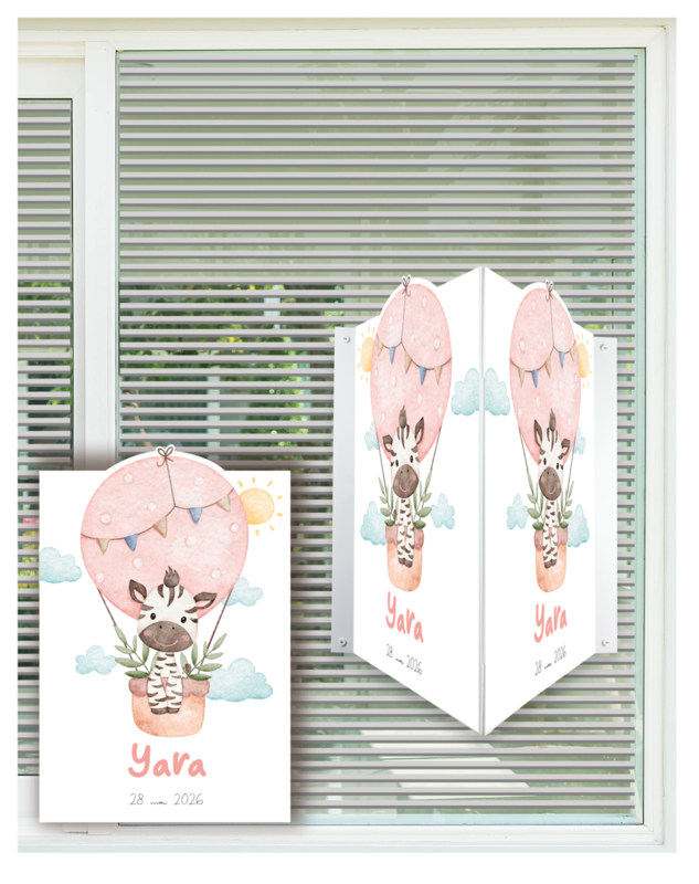 Dit raambord, makelaarsbord met zebra in luchtballon en naam ter aankondiging van de geboorte van een baby.