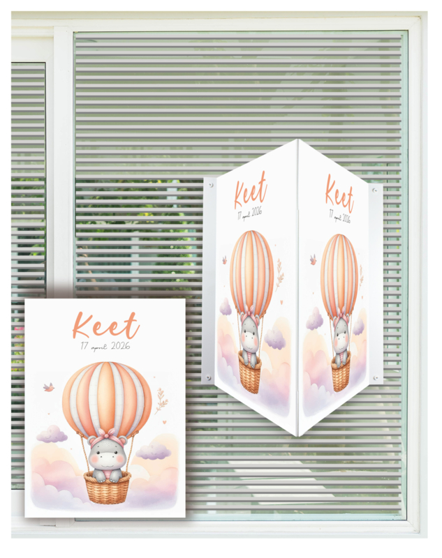 Dit raambord, makelaarsbord met nijlpaard in luchtballon en naam ter aankondiging van de geboorte van een baby.