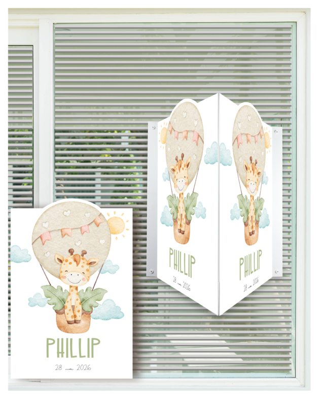 Dit raambord, makelaarsbord met giraffe in luchtballon en naam ter aankondiging van de geboorte van een baby.