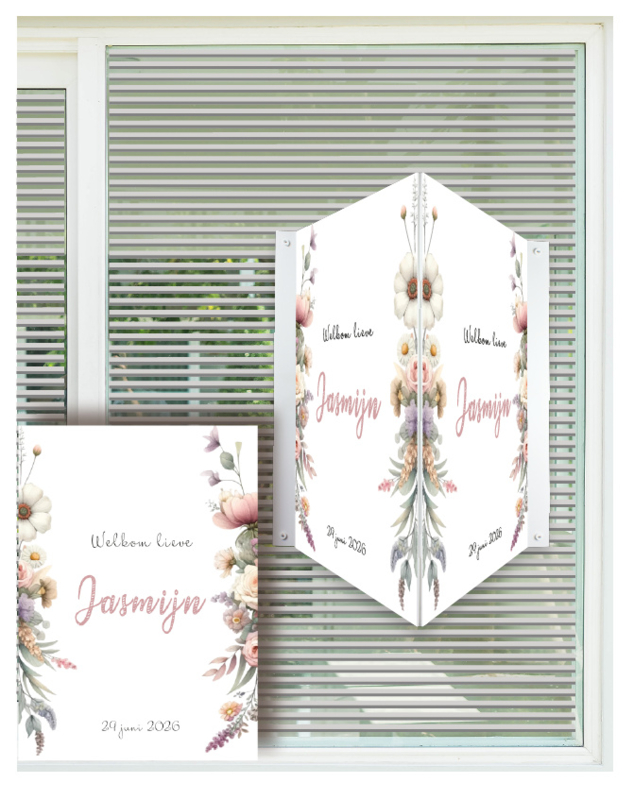 Dit raambord, makelaarsbord met bloemen en naam ter aankondiging van de geboorte van een baby.