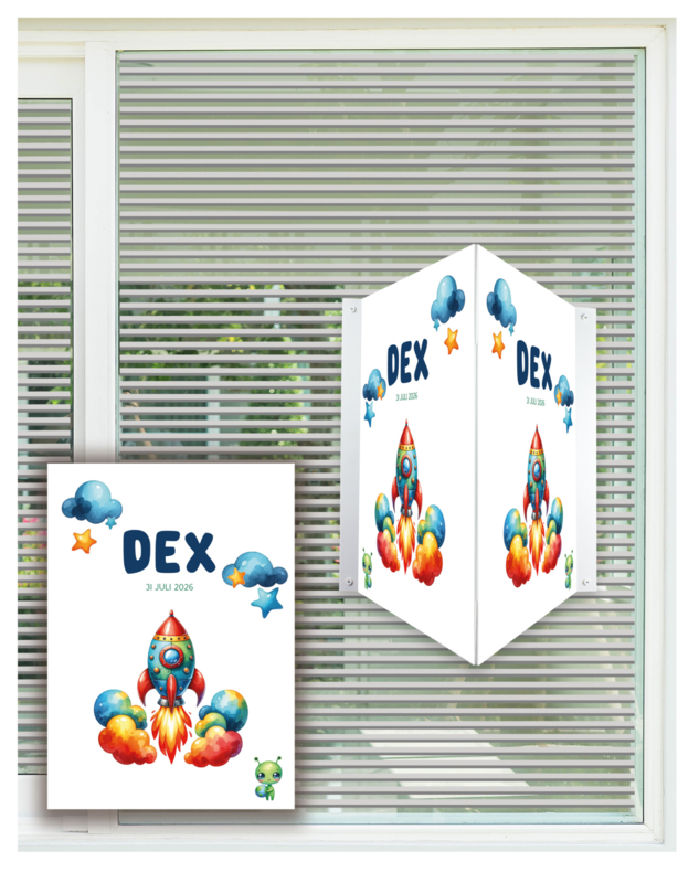 Artikelnummer: R052 OverzichtDit raambord, makelaarsbord, geboortebord of raamsticker met raket ter aankondiging van de geboorte van een baby.