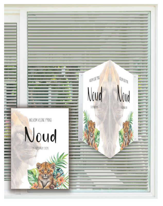 Artikelnummer: R045 OverzichtRaambord, makelaarsbord, geboortebord of raamsticker met baby leeuw en onscherpe afbeelding van moeder leeuw op de achtergrond ter aankondiging van de geboorte van een baby.