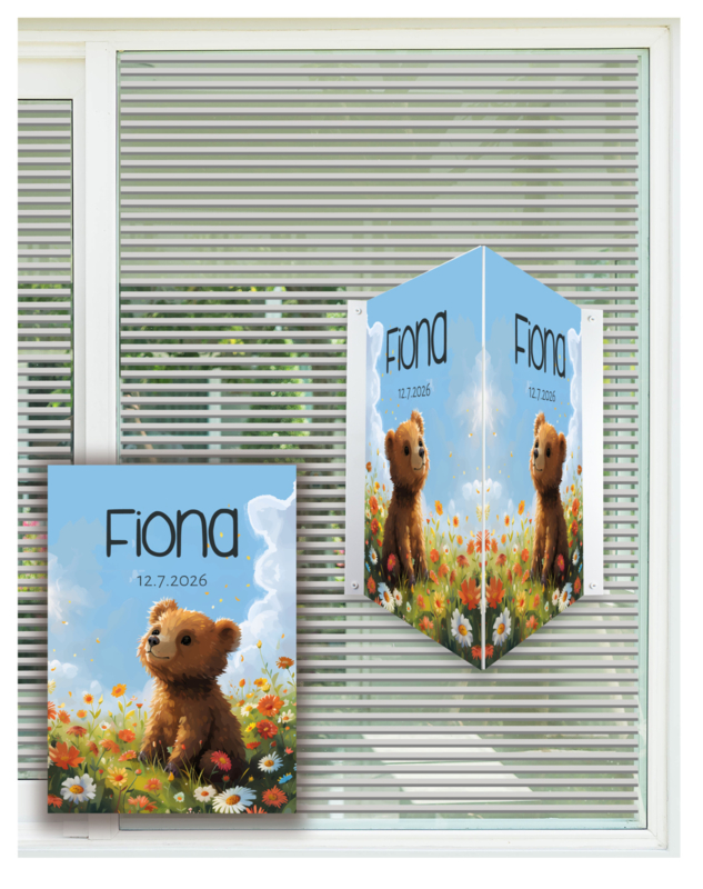 Artikelnummer: R047 OverzichtRaambord, makelaarsbord, geboortebord of raamsticker met beer in weide met bloemen, blauwe lucht en zon ter aankondiging van de geboorte van een baby.