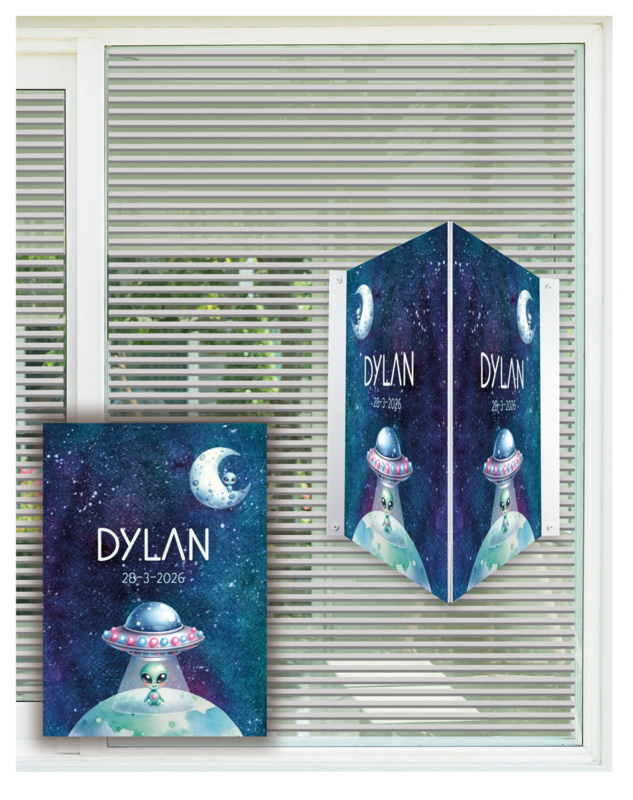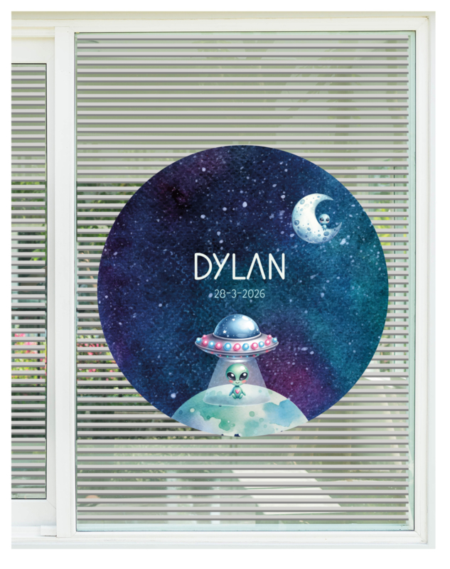 Artikelnummer: R048 OverzichtRaambord, makelaarsbord, geboortebord of raamsticker met marsmannetje, ufo, planeten, maan, aarde, sterren 048 ter aankondiging van de geboorte van een baby.