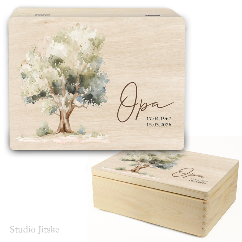 Alleen de bovenkant van de houten doos wordt bedrukt. Binnenkant deksel en/of zijkanten bedrukken is technisch net mogelijk.